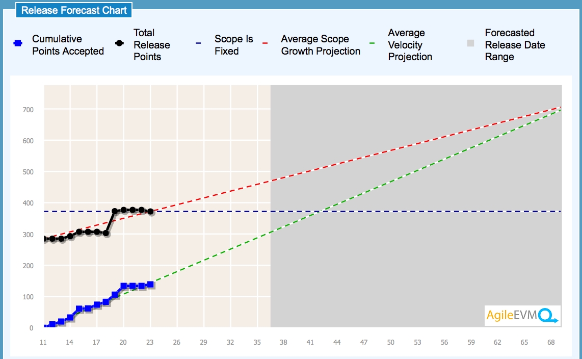AgileEVM allows teams to take the outcomes of their iterations as evidence of delivery and then generates progress reports for the release. The most commonly used report element is the Release Forecast Chart as seen below. It has similar characteristics to a Release Burnup Chart but adds a risk window as Dave Thomas had described in his keynote at Agile 2010. Rather than only showing progress towards a target based on units of work and iterations, the Release Forecast Chart also shows forecasts based on optimistic, pessimistic, and when under volatile conditions. These provide a more holistic picture of the current release progress along with an understanding of the potential risk to plans.