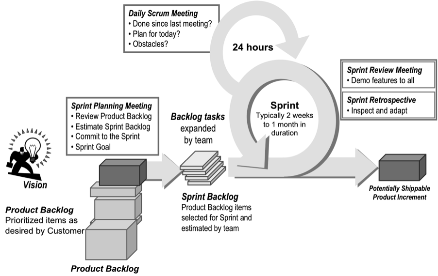 These may seem like innocuous statements but they are indicators of potential misinterpretation of how Scrum is best utilized. Scrum is not a full development process (although almost anything that has steps could be considered a ‘process’) and it is not a methodology. It does not tell you how to implement the software. It is a simple-looking framework that will help a group developing products figure out what is not working well so they can fix it. Here is the Scrum framework diagram: